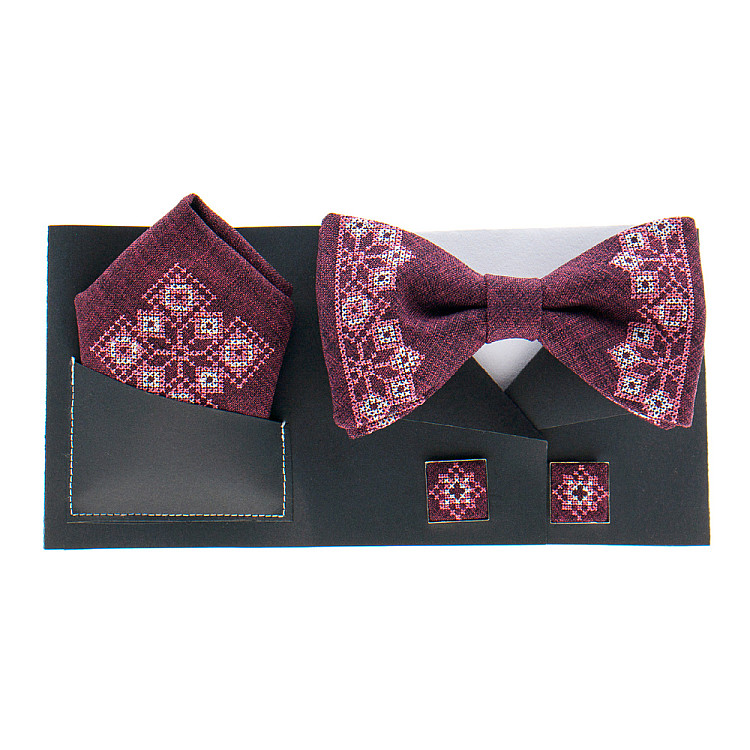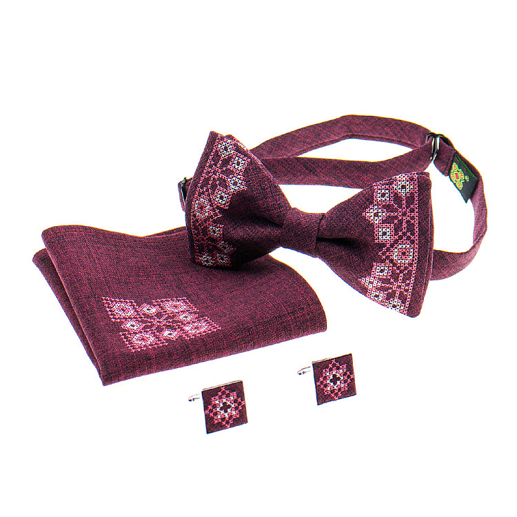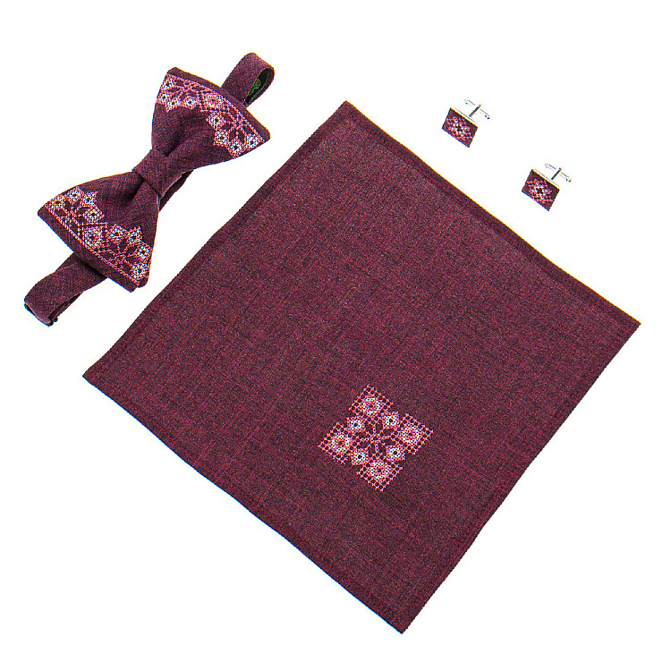Запитайте AI як краще поєднати Бордовий набір вишитий метеликз хустинкою і запонками №866 JN-0033 з вашим образом
