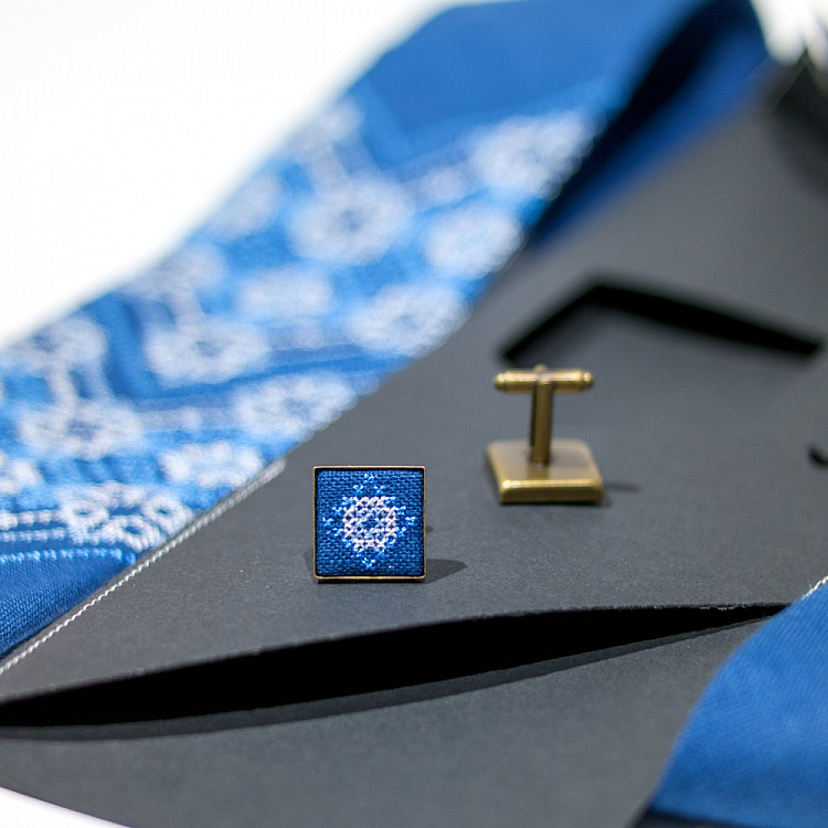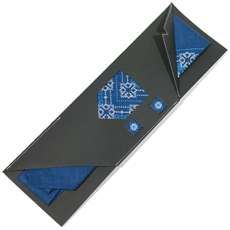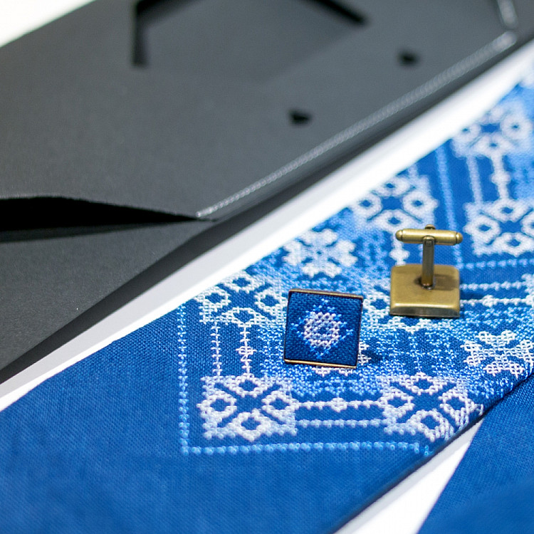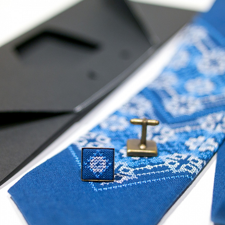 Темно-синій вишитий набір 2 в 1 з краваткою і запонками з льону №697 JN-0032