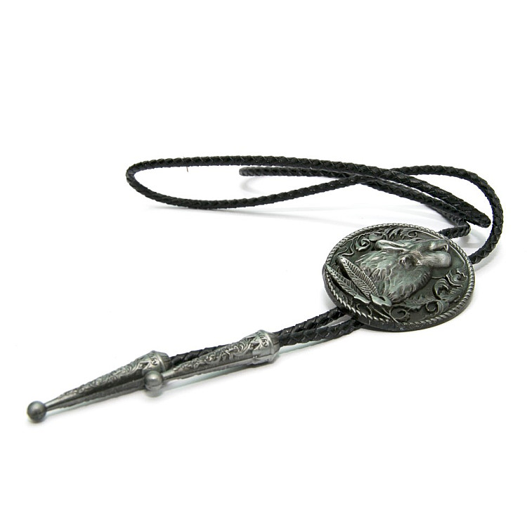 Боло представляет собой прочный кожаный шнурок длиной 94-95 см, скрепленный оригинальной брошью-пряжкой из нержавеющего металла. Брошь может изображать орла, коня, быка, маску, шляпу, звезду шерифа, крест и т.д. При покупке можно выбрать самый близкий по духу символ. Такие броши с изображениями духов-защитников носили североамериканские индейцы.