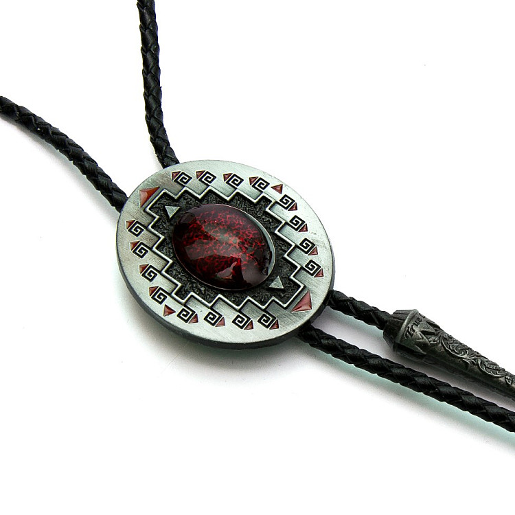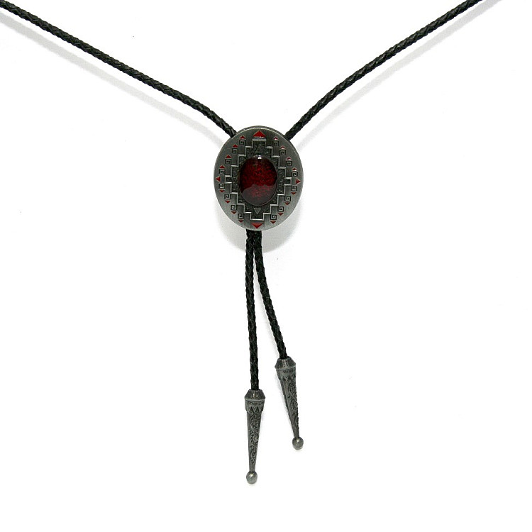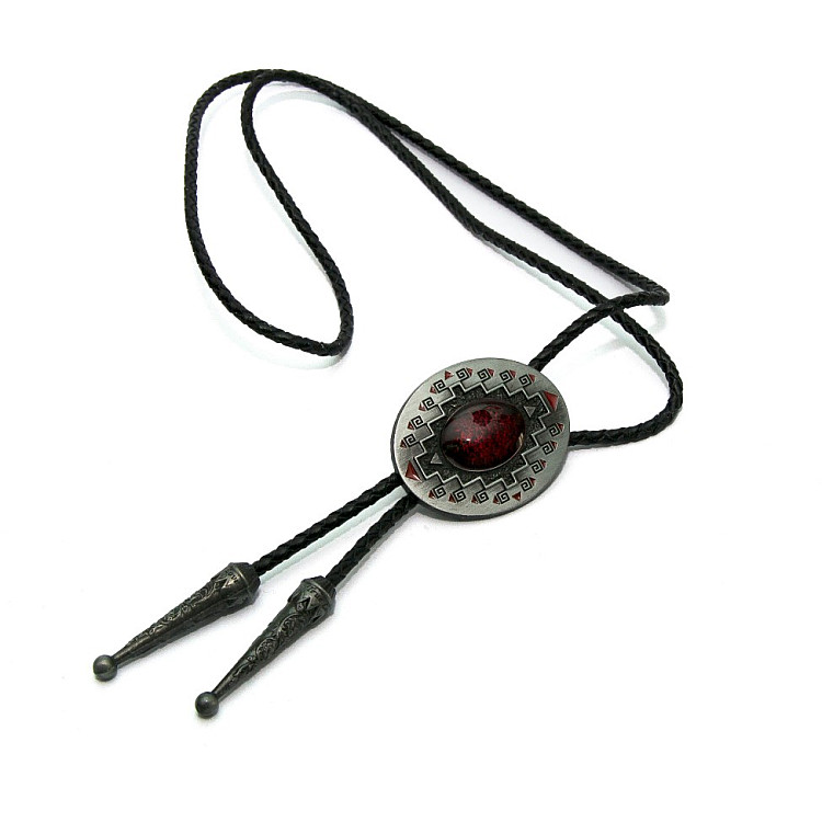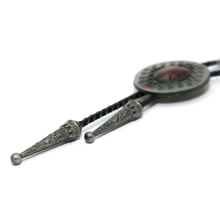 Боло представляет собой прочный кожаный шнурок длиной 94-95 см, скрепленный оригинальной брошью-пряжкой из нержавеющего металла. Брошь может изображать орла, коня, быка, маску, шляпу, звезду шерифа, крест и т.д. При покупке можно выбрать самый близкий по духу символ. Такие броши с изображениями духов-защитников носили североамериканские индейцы.