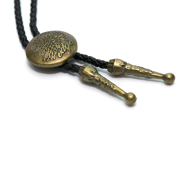 Боло представляет собой прочный кожаный шнурок длиной 94-95 см, скрепленный оригинальной брошью-пряжкой из нержавеющего металла. Брошь может изображать орла, коня, быка, маску, шляпу, звезду шерифа, крест и т.д. При покупке можно выбрать самый близкий по духу символ. Такие броши с изображениями духов-защитников носили североамериканские индейцы.