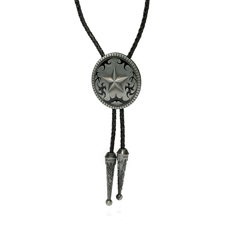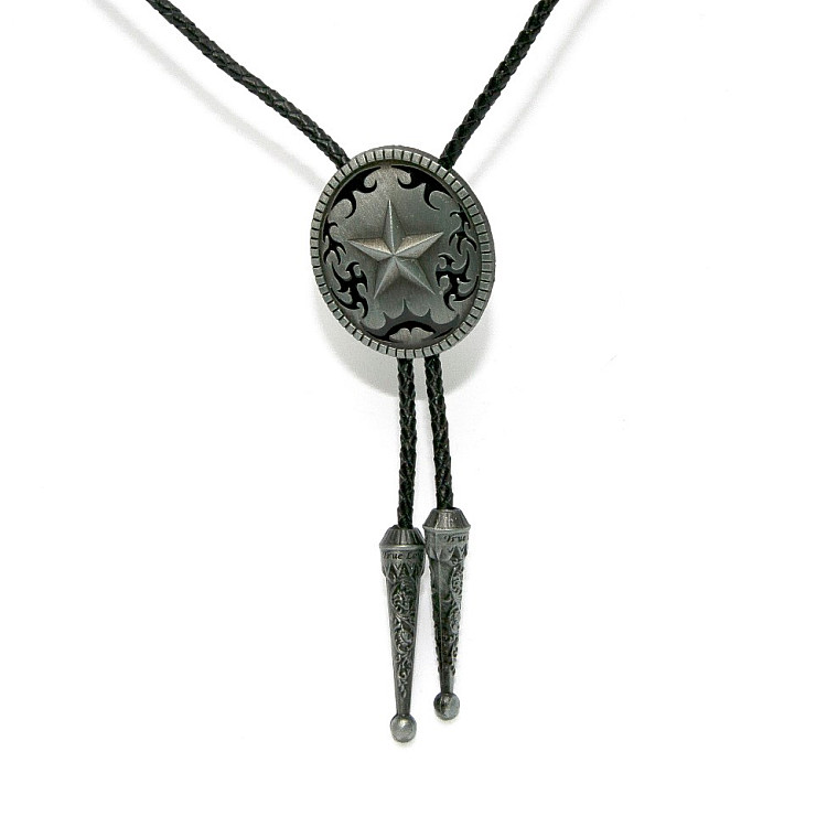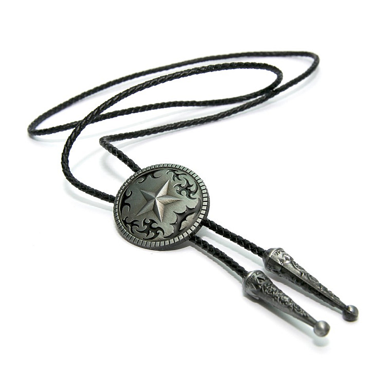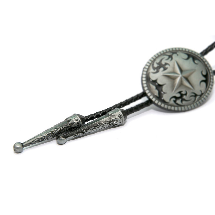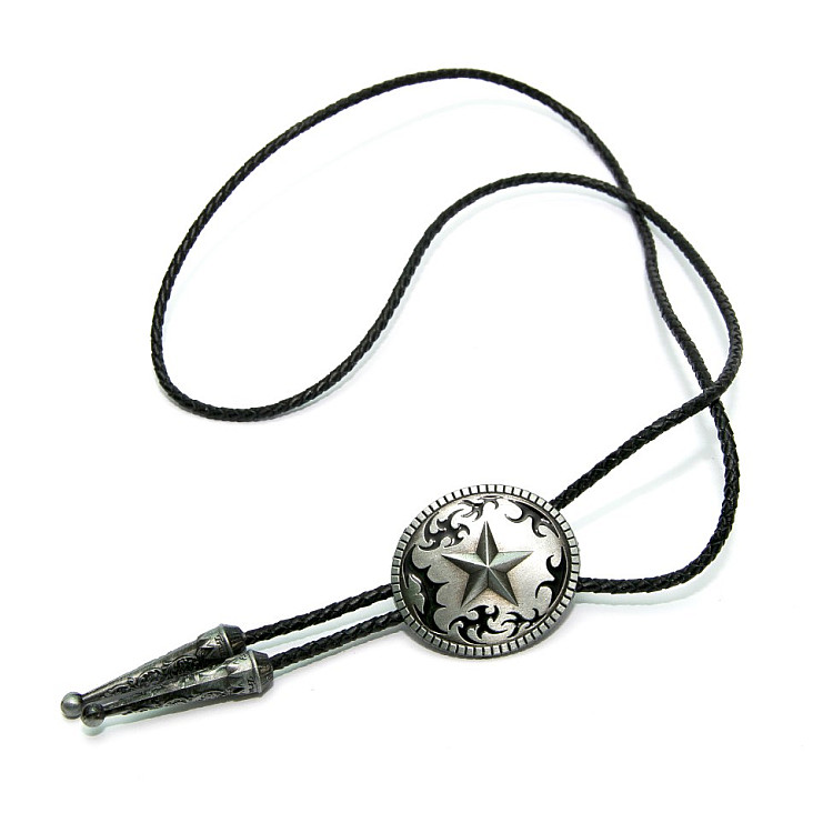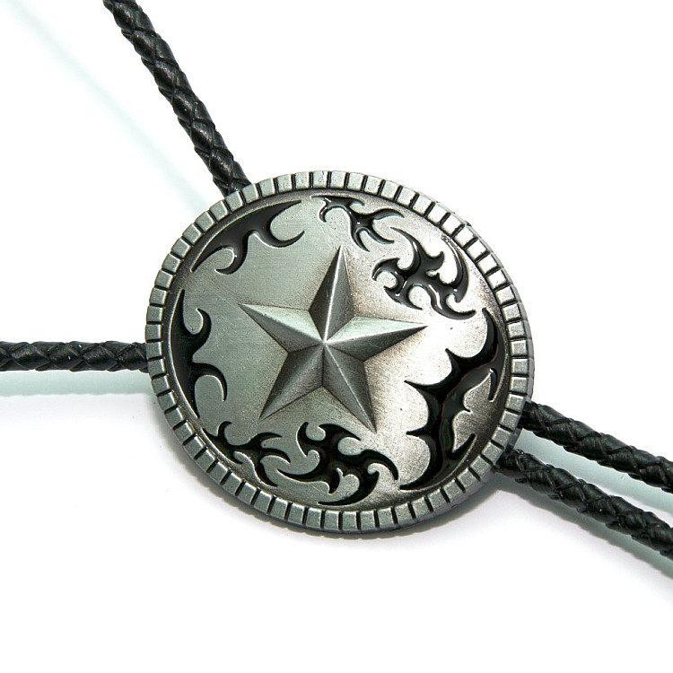 Боло представляет собой прочный кожаный шнурок длиной 94-95 см, скрепленный оригинальной брошью-пряжкой из нержавеющего металла. Брошь может изображать орла, коня, быка, маску, шляпу, звезду шерифа, крест и т.д. При покупке можно выбрать самый близкий по духу символ. Такие броши с изображениями духов-защитников носили североамериканские индейцы.