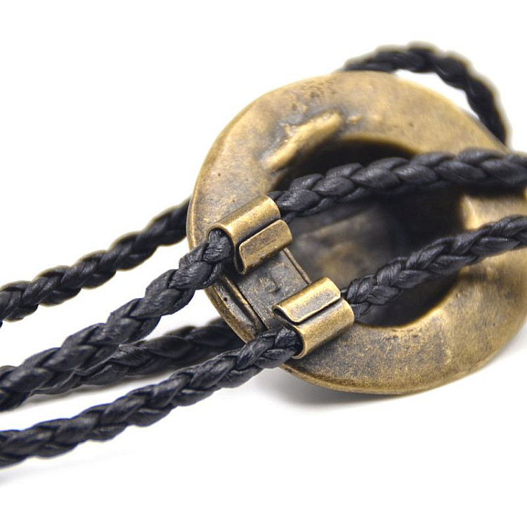 Боло представляет собой прочный кожаный шнурок длиной 94-95 см, скрепленный оригинальной брошью-пряжкой из нержавеющего металла. Брошь может изображать орла, коня, быка, маску, шляпу, звезду шерифа, крест и т.д. При покупке можно выбрать самый близкий по духу символ. Такие броши с изображениями духов-защитников носили североамериканские индейцы.