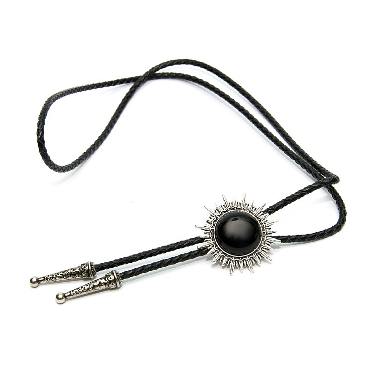 Боло представляет собой прочный кожаный шнурок длиной 94-95 см, скрепленный оригинальной брошью-пряжкой из нержавеющего металла. Брошь может изображать орла, коня, быка, маску, шляпу, звезду шерифа, крест и т.д. При покупке можно выбрать самый близкий по духу символ. Такие броши с изображениями духов-защитников носили североамериканские индейцы.