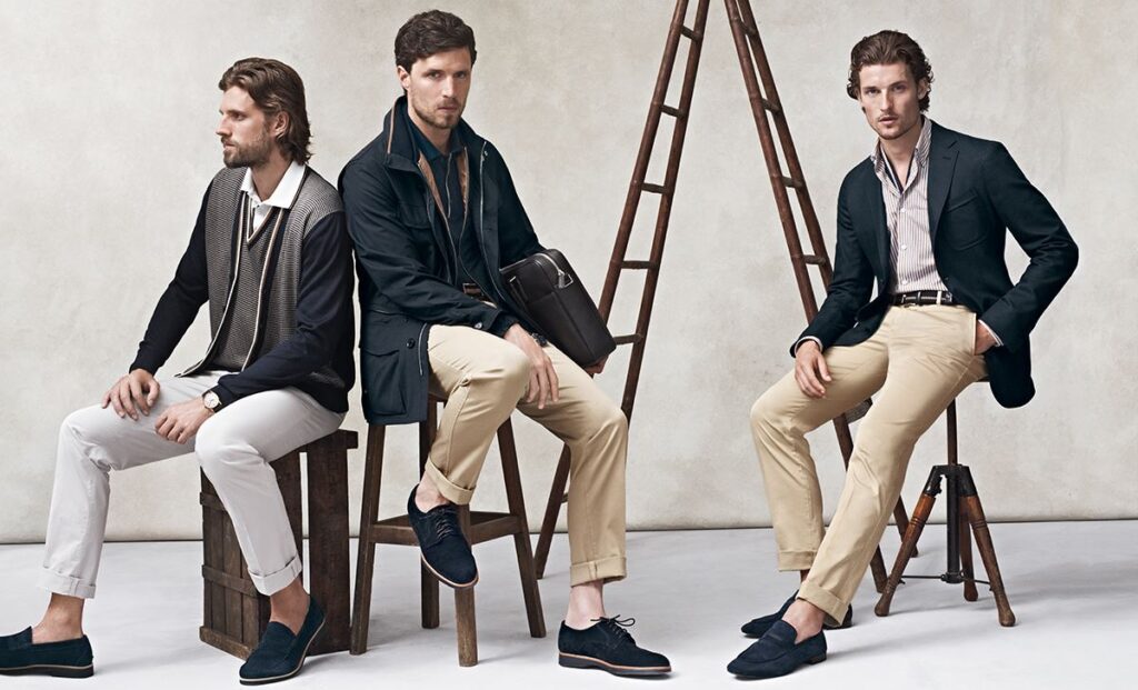 Как и для девушек, для мужчин актуальны сочетания белых базовых футболок с темными или классическими синими джинсами. Популярны стильные и прочные джинсы из вощеного денима. С 2019 года на подиумах остаются зауженные брюки, к которым надевают вязаный трикотаж некрупной фактуры или пиджаки из замши, шерсти и кожи.