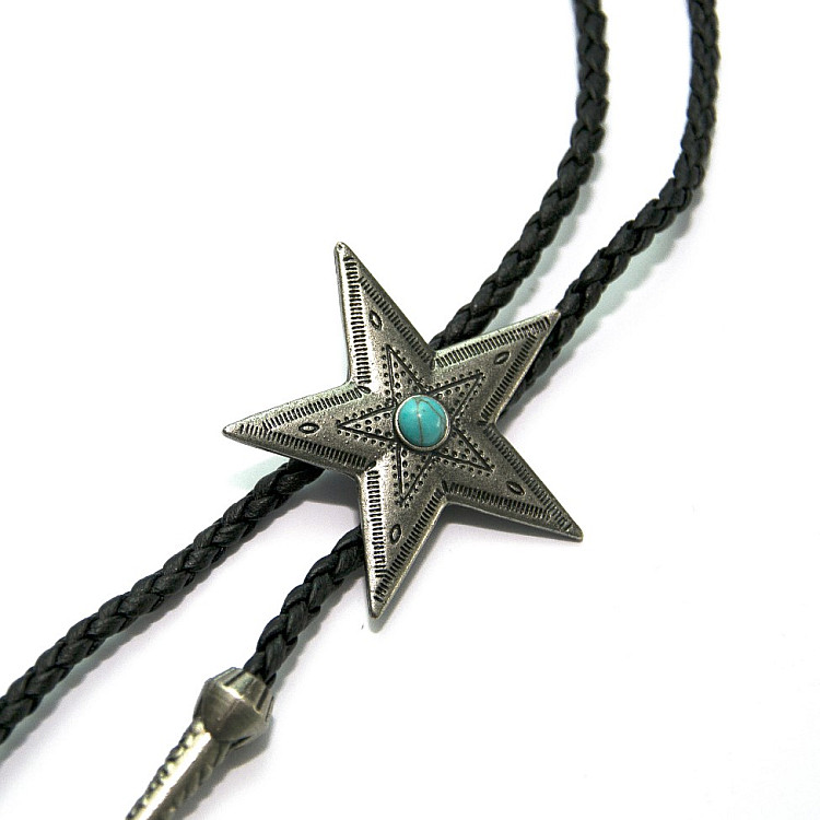 Боло представляет собой прочный кожаный шнурок длиной 94-95 см, скрепленный оригинальной брошью-пряжкой из нержавеющего металла. Брошь может изображать орла, коня, быка, маску, шляпу, звезду шерифа, крест и т.д. При покупке можно выбрать самый близкий по духу символ. Такие броши с изображениями духов-защитников носили североамериканские индейцы.