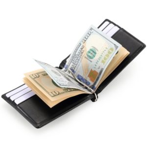 Стандартный зажим похож на компактное портмоне, но имеет центральное металлическое крепление для надежной фиксации купюр. Аксессуары этого типа могут иметь от одного до шести карманов для пластиковых карт. Обычно не имеют застежки.