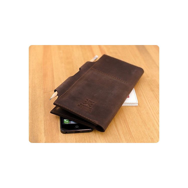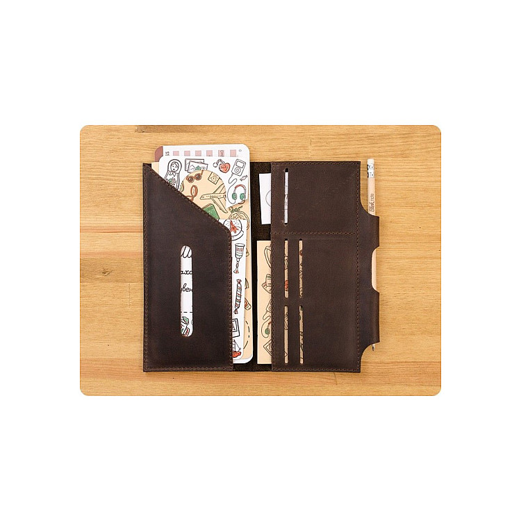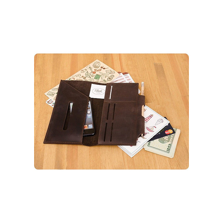 Цей холдер для документів зручного розміру, в якому помістяться посадочні талони (або залізничні квитки), паспорти, гроші і маса інших корисних речей, які повинні бути завжди під рукою у подорожі. Холдер зроблений повністю вручну з цілісного шматка дуже щільної (2 мм) натуральної шкіри.